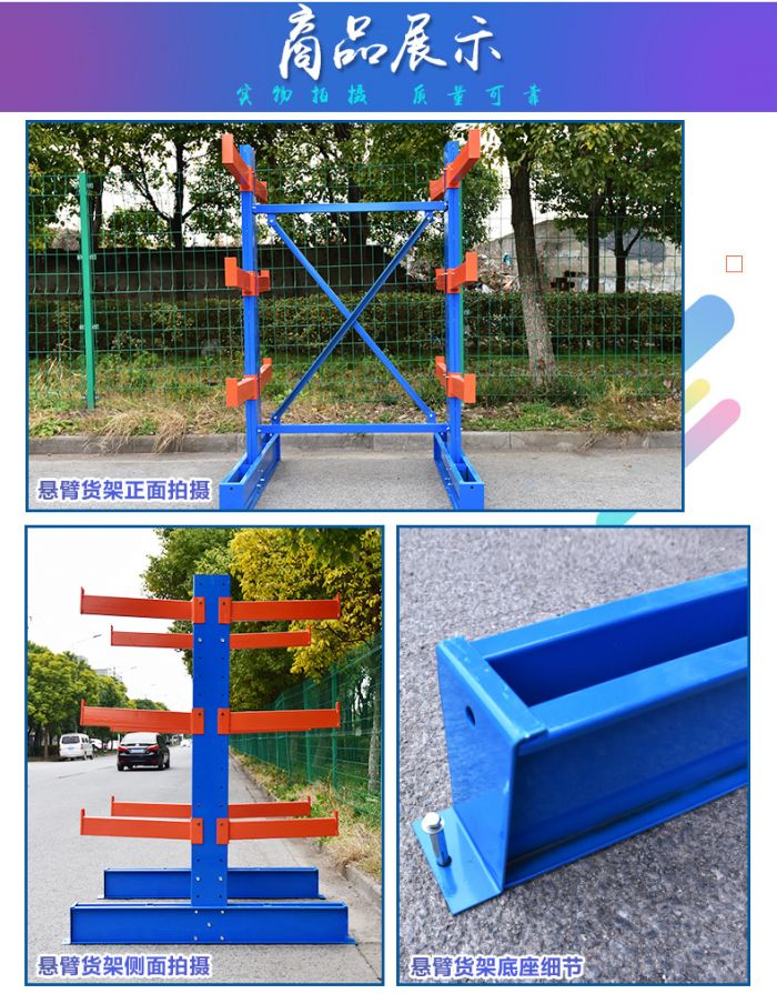 1、懸臂貨架(jià)係列全部采用組合(hé)式,拆裝,運輸,調節(jiē),移動等簡易方便,安全可靠。