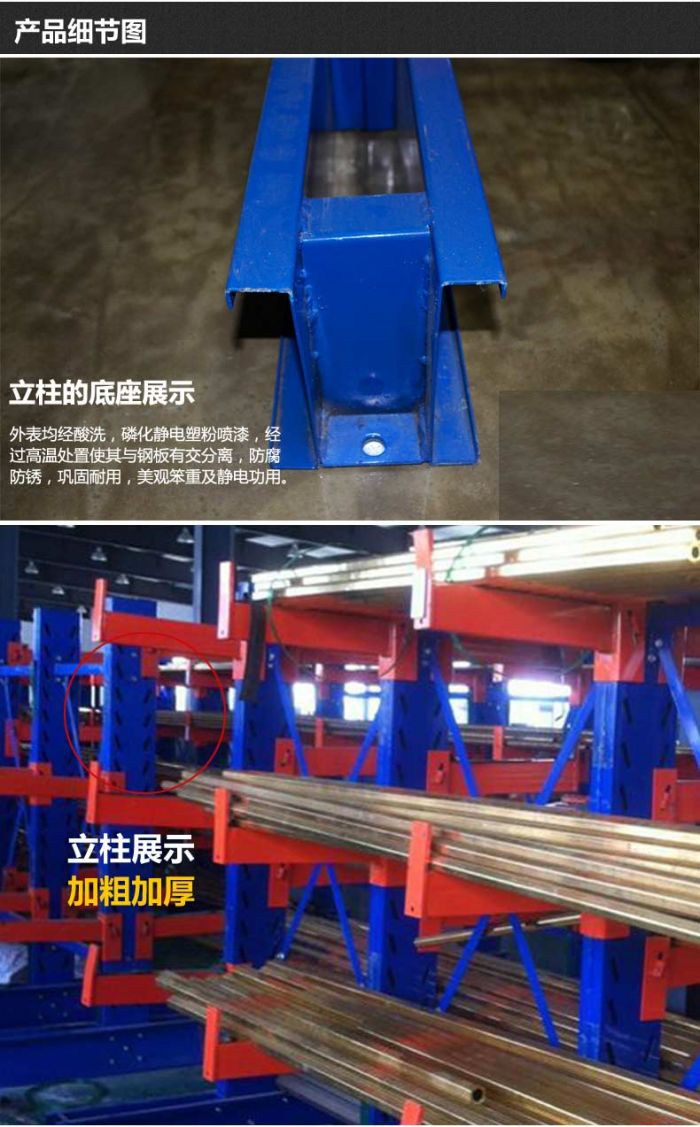 冷軋型鋼或H型鋼(gāng),懸臂與立柱間采用插(chā)接式或螺栓連接式,底座與立柱間采(cǎi)用螺栓連(lián)接式,底座采用(yòng)冷軋型鋼或(huò)H型鋼。貨物存取由叉車、行車或人工進行(háng)。貨架高度通常在2.5米(mǐ)以內(如