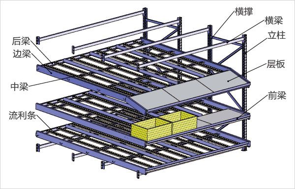 流利式貨架簡稱流利架,是(shì)將貨物置於滾(gǔn)輪上,利用(yòng)一邊通道存貨,另一邊(biān)通道取貨。料架朝出貨方向向下傾斜,貨物在中(zhōng)立作用下向下滑動(dòng)。可實現先進先出,並可實(shí)現一次(cì)補貨,多次揀(jiǎn)貨。流利架(jià)存儲(chǔ)效率高。適合大量貨物的短期存放和揀選。流利架(jià)廣泛應用於配送中心(xīn)、裝配車間以及出貨頻率較高的倉庫。